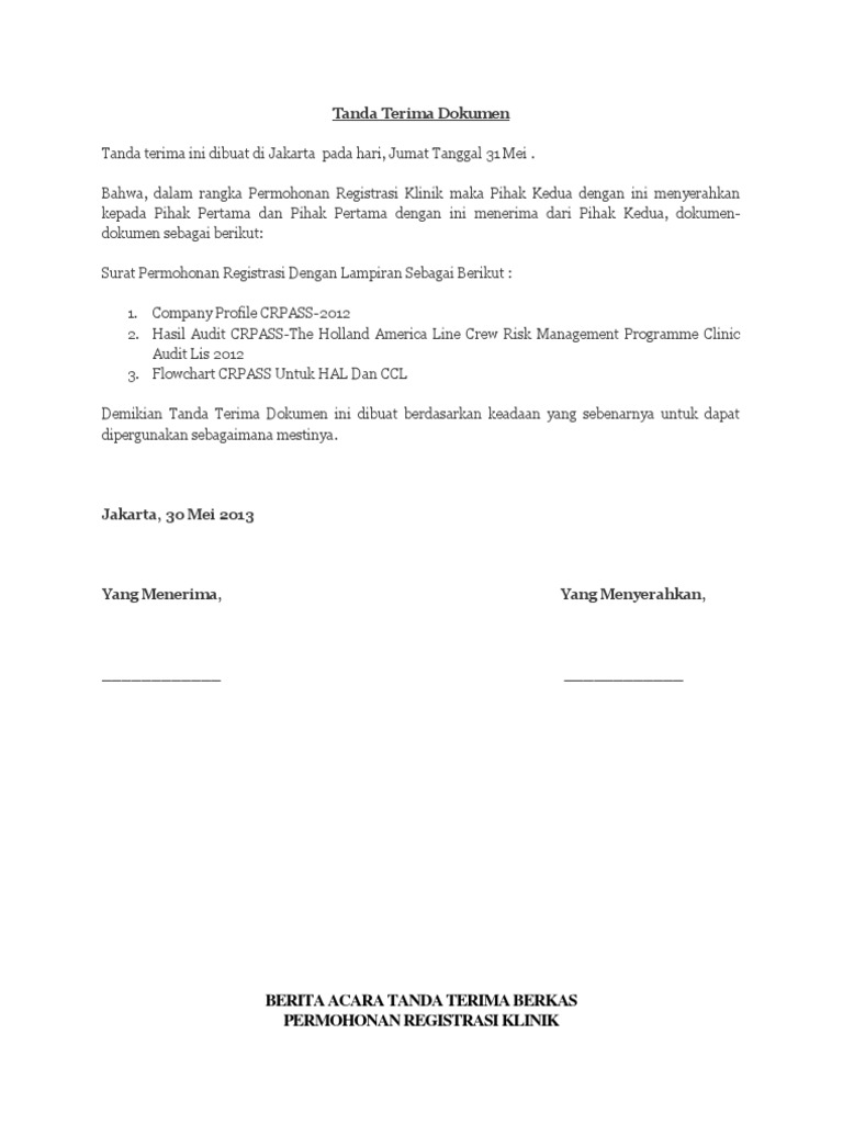 Bahwa, dalam rangka permohonan registrasi klinik maka pihak kedua dengan ini menyerahkan kepada pihak pertama dan pihak pertama dengan ini menerima dari pihak kedua, dokumendokumen sebagai. Tanda terima dokumen tanda terima ini dibuat di jl. Surat tanda terima barang merupakan bagian penting terkait dengan penerimaan barang atau jasa. Contoh di atas dapat anda tiru sebagaimana mestinya guna kepentingan organisasi yang anda pimpin. Misalkan saja dokumen pertanahan seperti sertifikat tanah atau dokumen penting lain milik perusahaan. Tanda terima dokumen tanda terima ini dibuat di jl. Perhatikan cara menyimpan dokumen penting milik anda agar tidak rusak!] #6 contoh surat tanda terima barang. Dzul fadlil adzim r dalam hal ini bertindak untuk dan atas nama cv. Kita akan sambung lagi dengan penjelasan tentang jenis surat yang lain. Contoh mudahnya adalah seorang kurir pengantaran paket selalu meminta tanda tangan penerimanya setelah barang diserahkan. Tanda terima sangat penting baik untuk keperluan perorangan maupun untuk aktivitas perkantoran instansi atau perusahaan. 16 makassar pada hari rabu tanggal 06 februari 2013 oleh dan diantara : Surat tanda terima merupakan sebuah tanda bukti yang dikirimkan oleh lembaga atau instansi terkait.